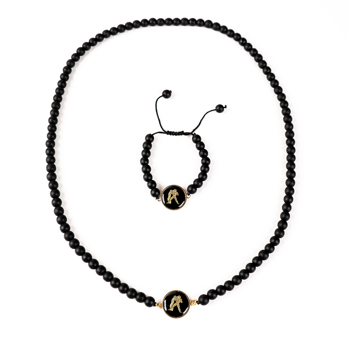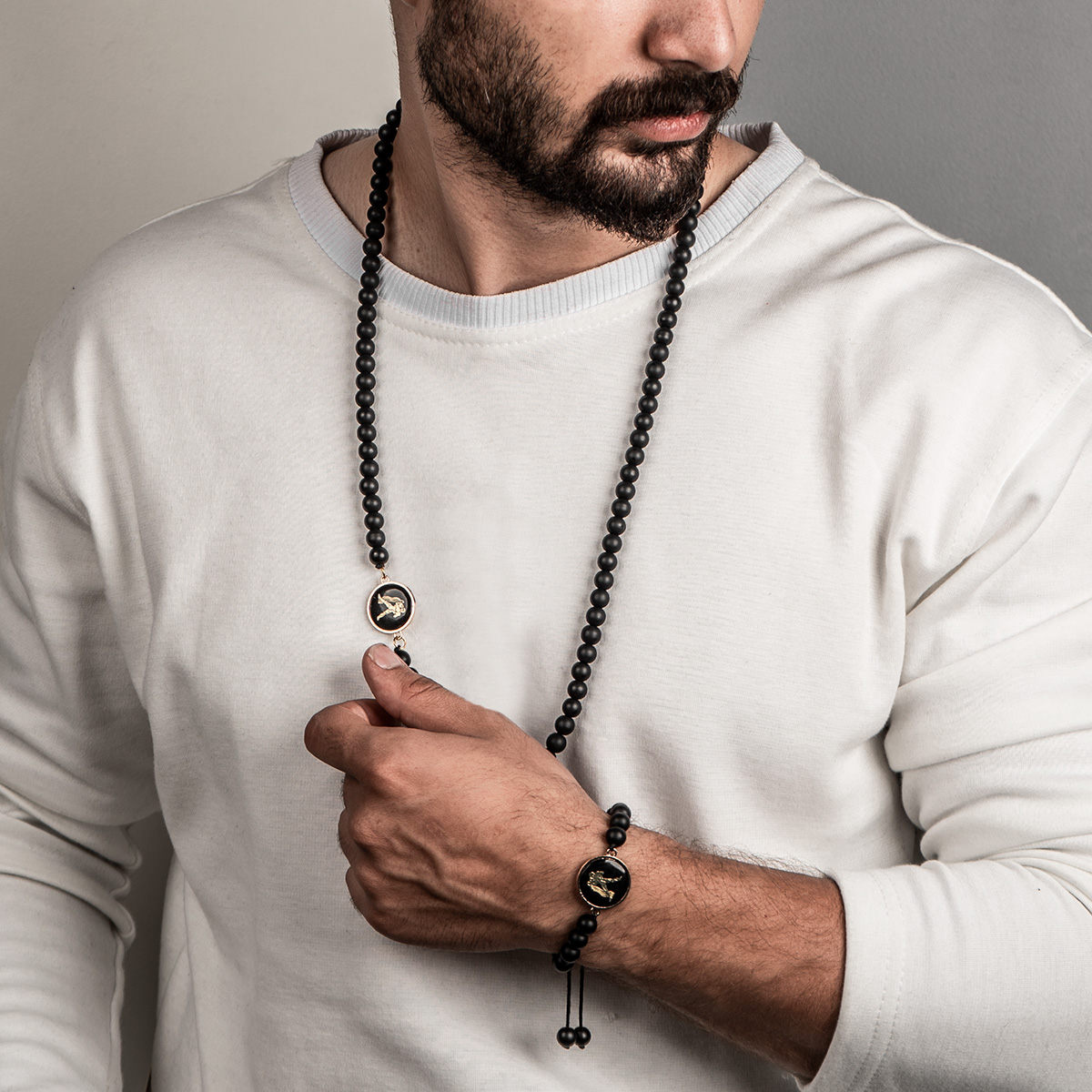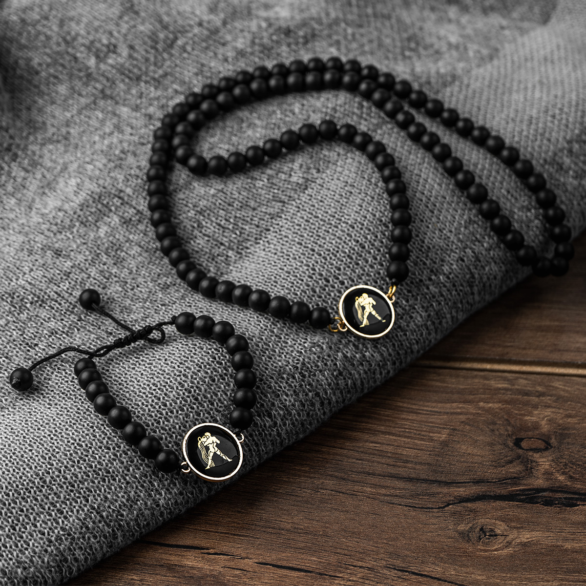 نیم ست های مهره ای مشکی از انواع گردنبندهای رو لباسی است که محبوبیت خاصی بین جوانان پیدا کرده است و جذابیت زیادی به استایل شما میدهد.طرح روی پلاک این گردنبندها نماد ماه های سال بوده و میتوانید ماه مورد نظرتان را انتخاب نمایید. قطر سنگ ها 2 میلی متر و به رنگ مشکی مات بوده و به دلیل طراحی خاص، برای استفاده روزانه و قابل ست شدن با انواع پوشش ها و مناسب برای آقایان و خانم هاست.