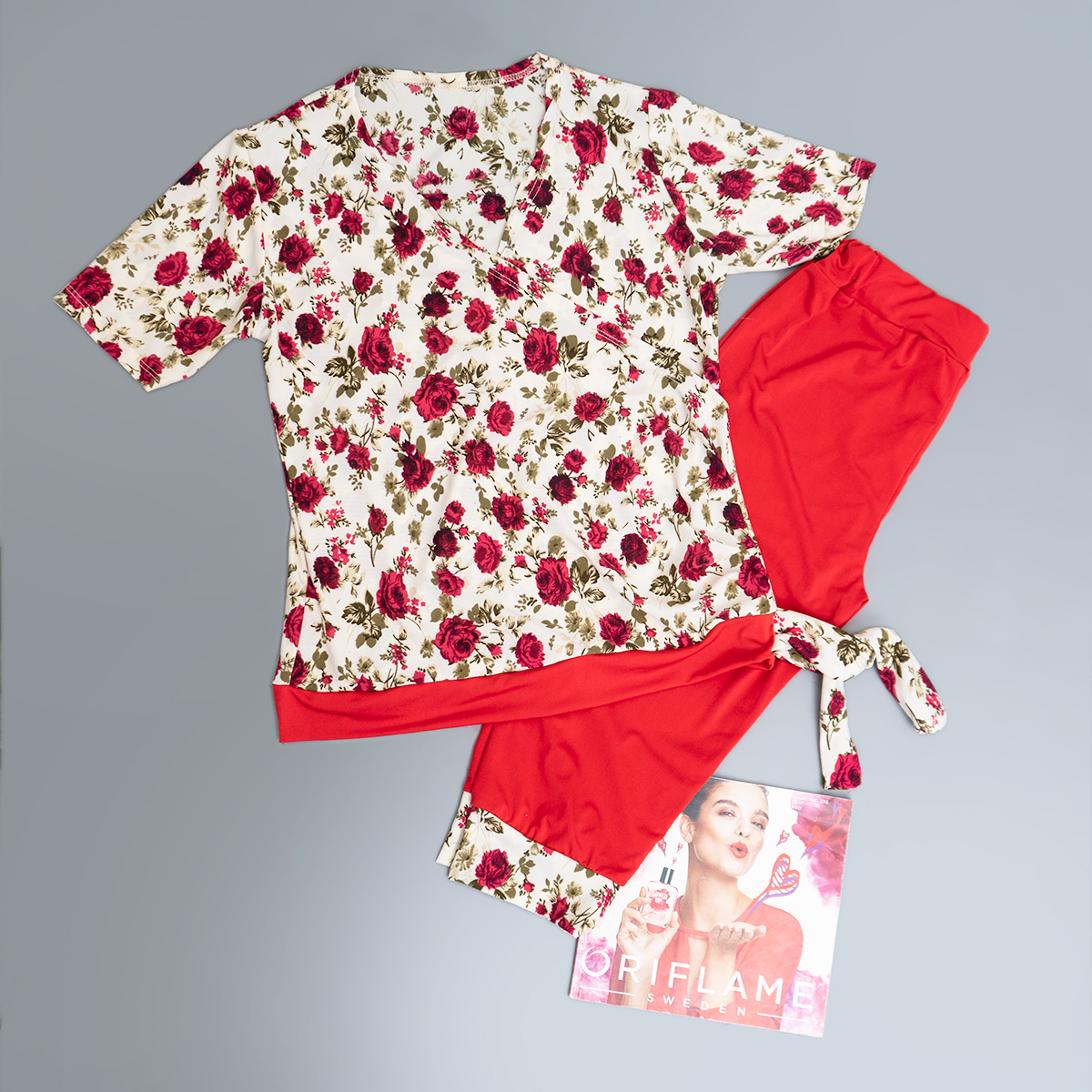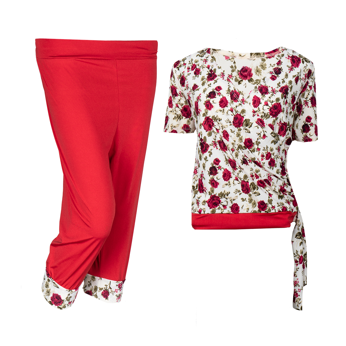 ست تیشرت شلوارک زنانه گل دار قرمز مدل ADELA