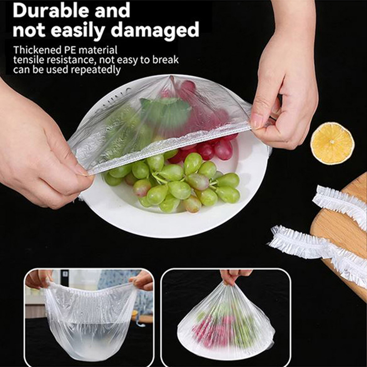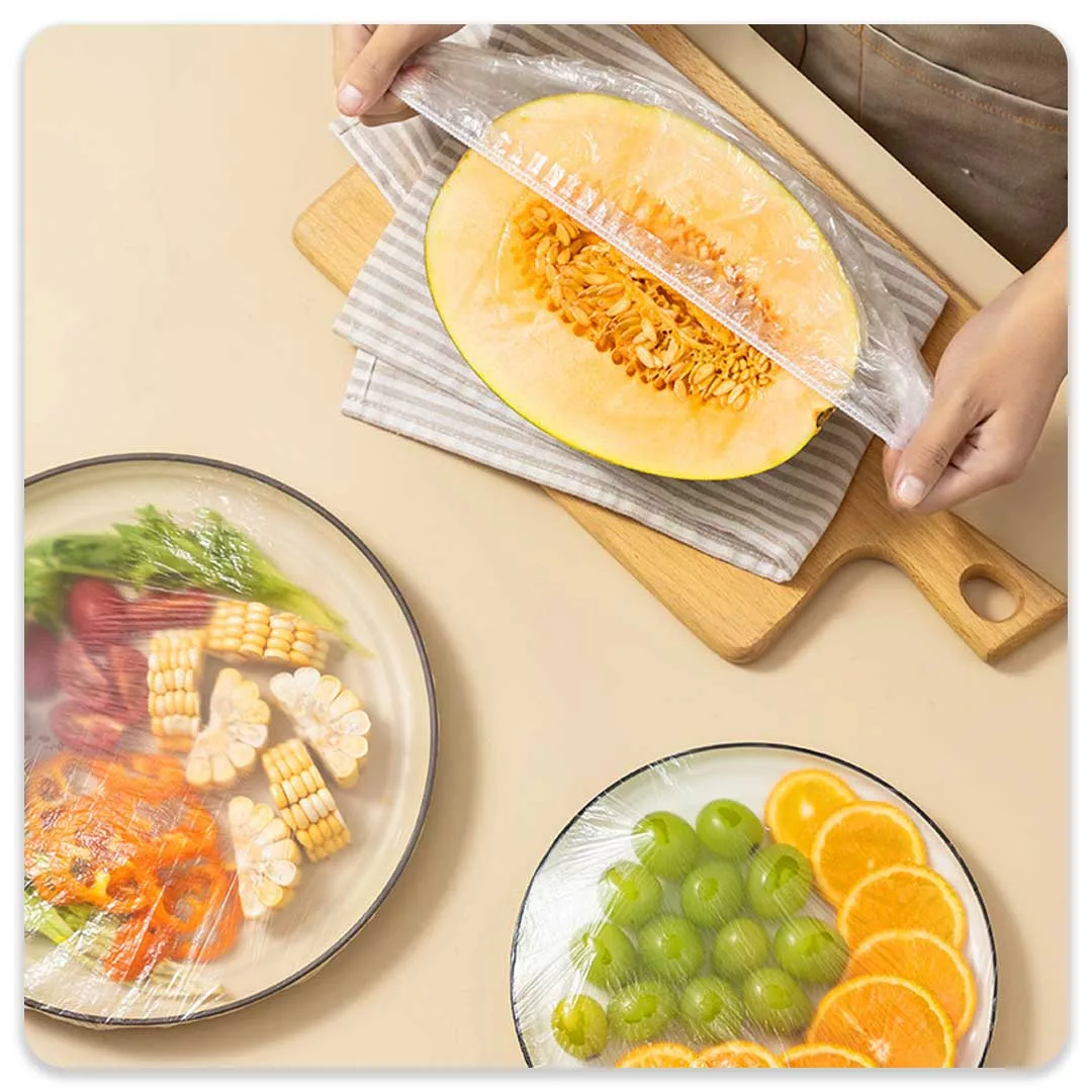 درپوش همه کاره مواد غذایی بسته 100 عددی جنس پلاستیکی با کش دور دوز شده مناسب استفاده به عنوان کلاه حمام ضد آب و کلاه رنگ مو و استفاده به عنوان در ظروف برای ماندگاری بیشتر مواد غذایی و میوه ،این درپوش همه کاره ظرف یکبار مصرف جنسی بسیار انعطاف پذیر برای بستن انواع درب ها از جمله انواع کاسه ، بشقاب ، قابلمه و … دارد.